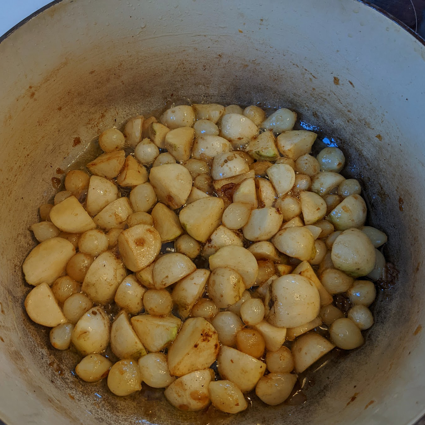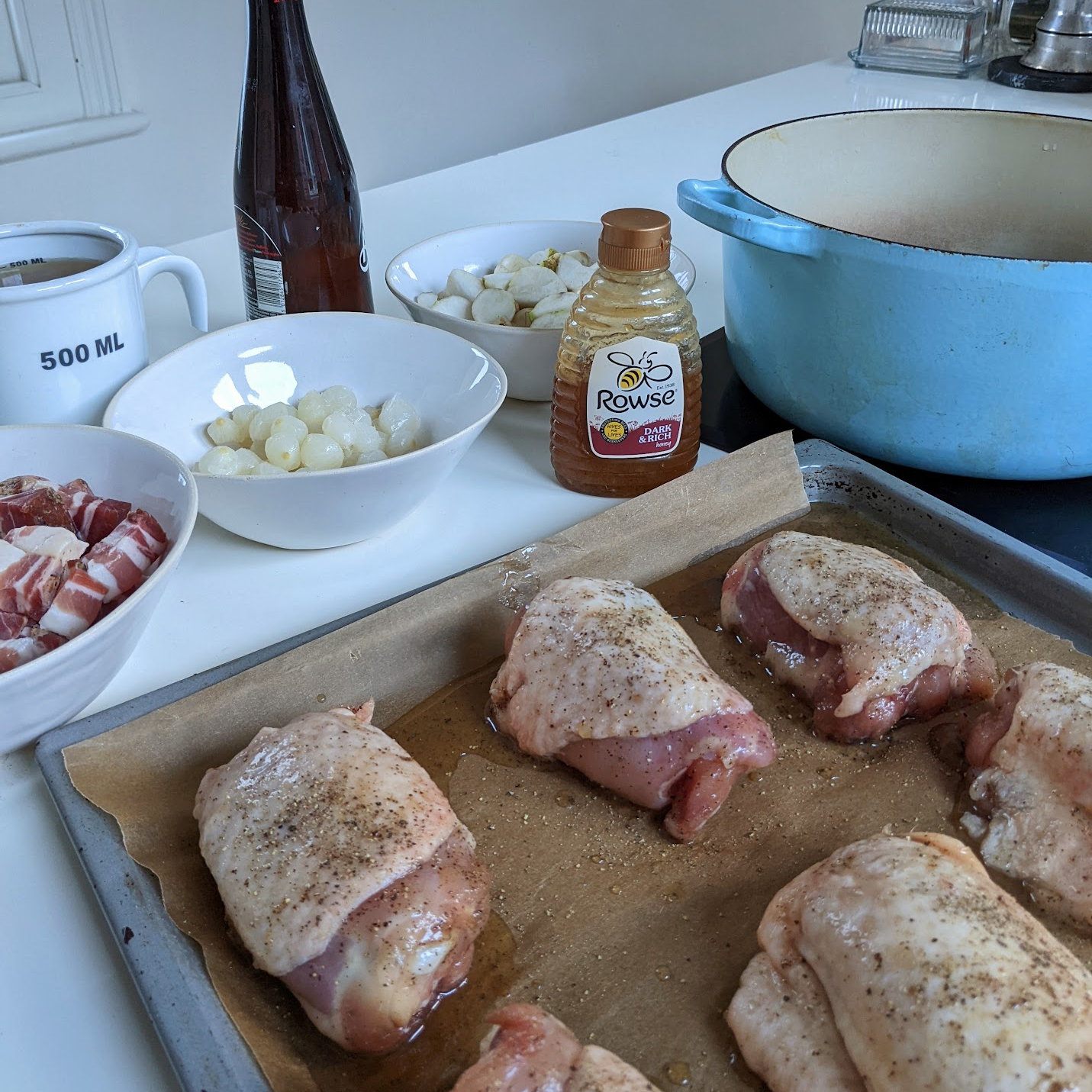 Step 4Sauté the pearl onions over a high heat until starting to colour. Add the turnips and continue to sauté. When they are starting to caramelise, reintroduce the lardons, place the roast chicken thighs skin side up, and pour in the cider and chicken stock.