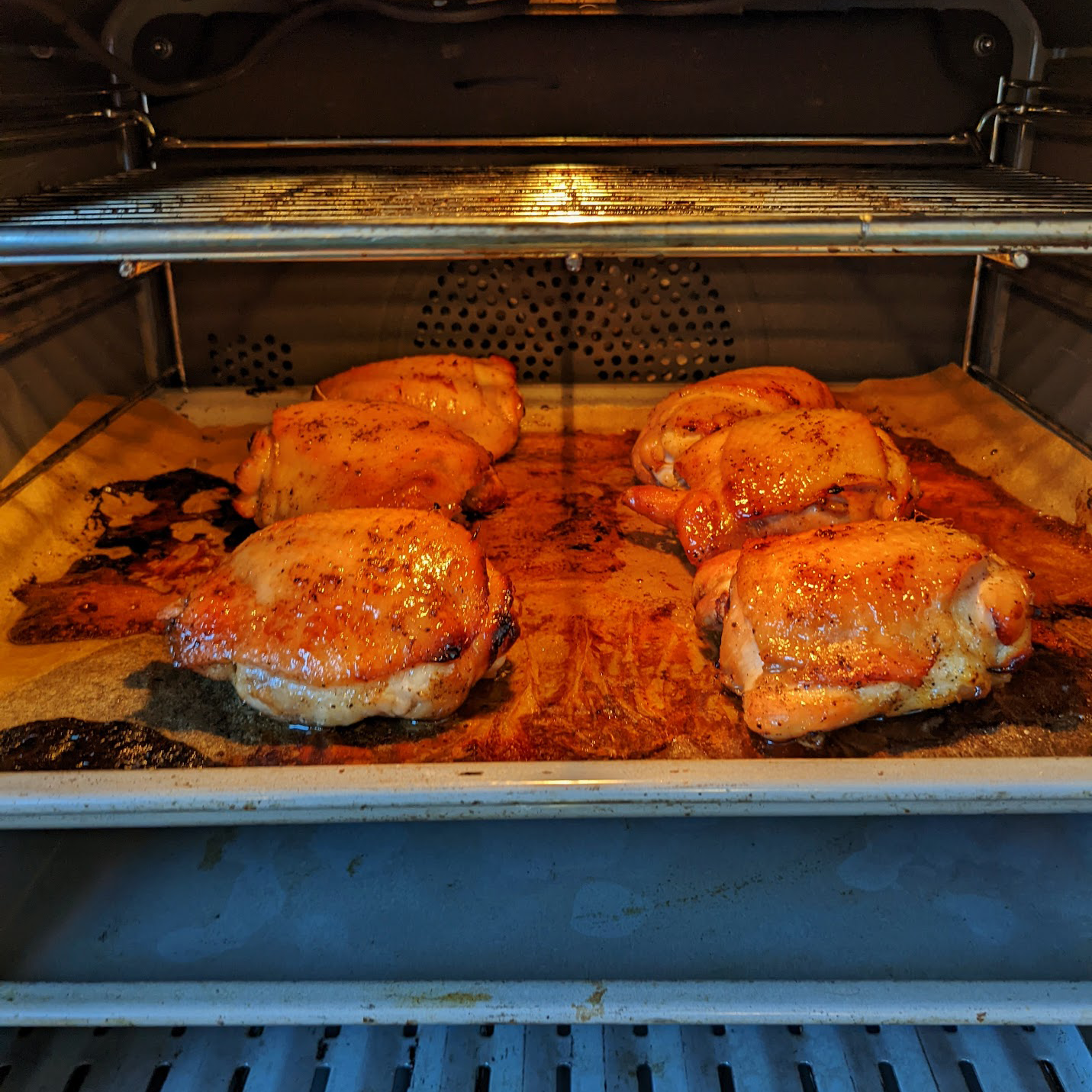 Step 2Set an oven to 220 degrees and arrange the thighs on parchment with space between them. Roast for 15 minutes until fully browned.