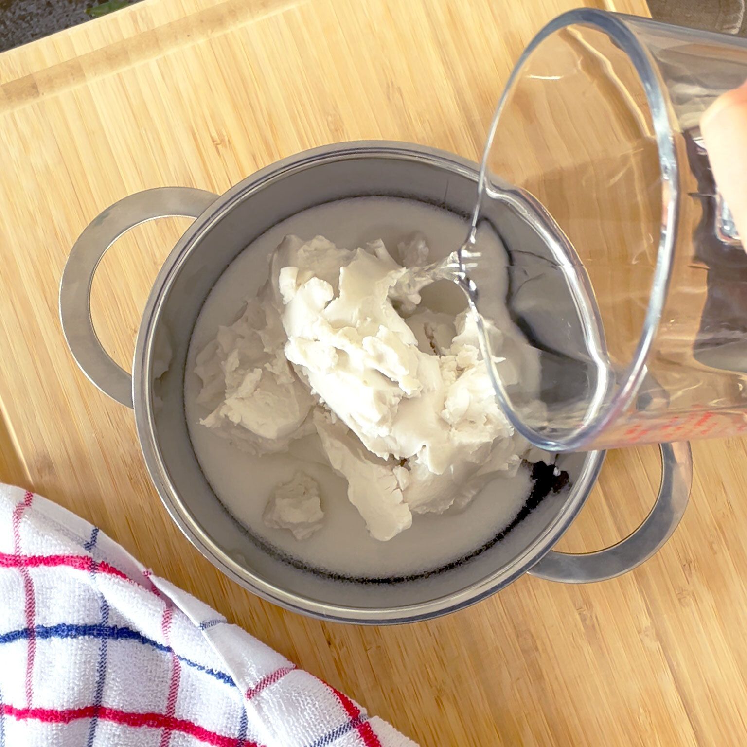 Step 5Put the sugar, water, coconut cream and honey in a medium sized saucepan and place on medium heat. Bring to a gentle boil and remove from heat. Add melted gelatine and stir until well combined.