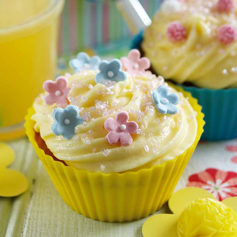 To make the frosting, beat the butter in a bowl until smooth and creamy. Gradually sift in the icing sugar, beating well between each addition. Beat in the low fat soft cheese, honey, lemon zest and food colouring. Pipe or spread on top the cakes, then decorate.
