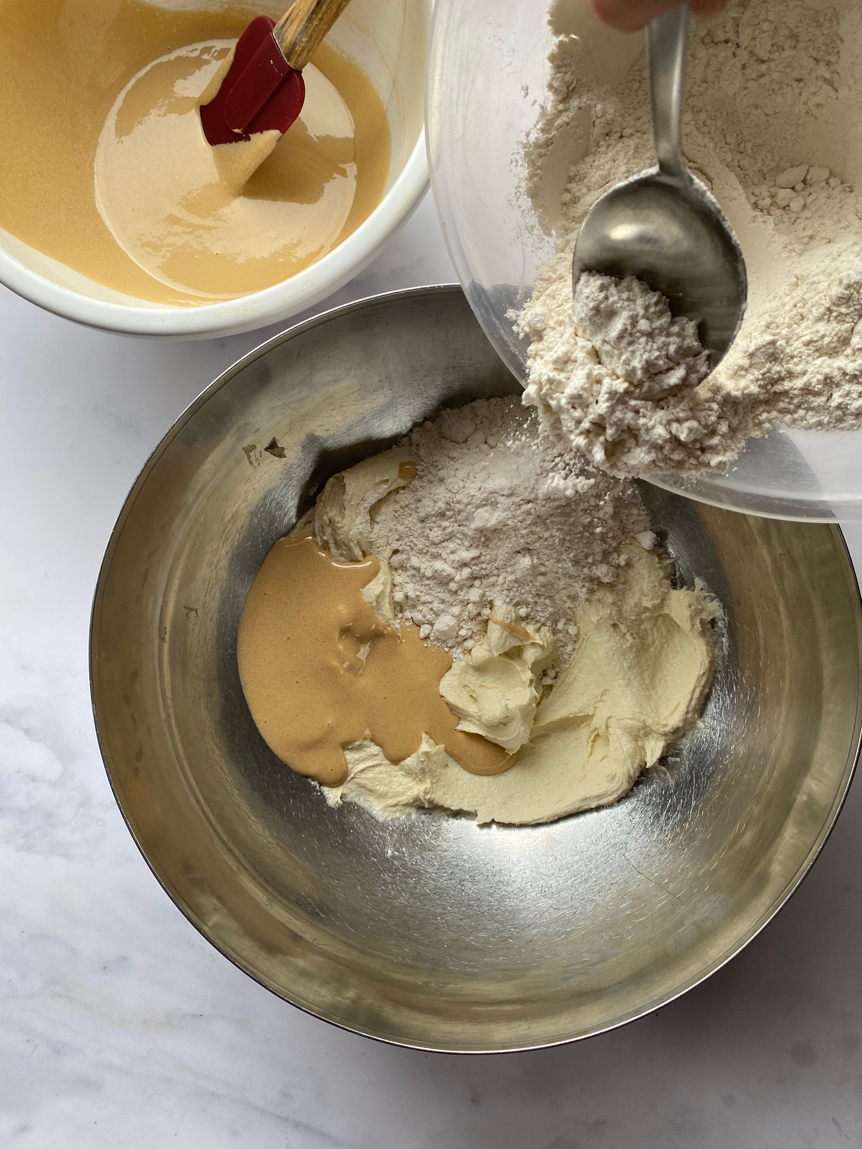 Step 1In a tabletop mixer or a large mixing bowl with electric whisks, beat together the butter and 200g golden caster sugar for 5 mins until light and fluffy. In another large bowl add the egg whites and whisk until you have soft peaks. Gradually add the remaining 100g of golden caster sugar and whisk until glossy and stiff peaks form. In a separate bowl add the egg yolks with the soft brown sugar and whisk until thickened and doubled in size. Sift the flour into a bowl with the baking powder.