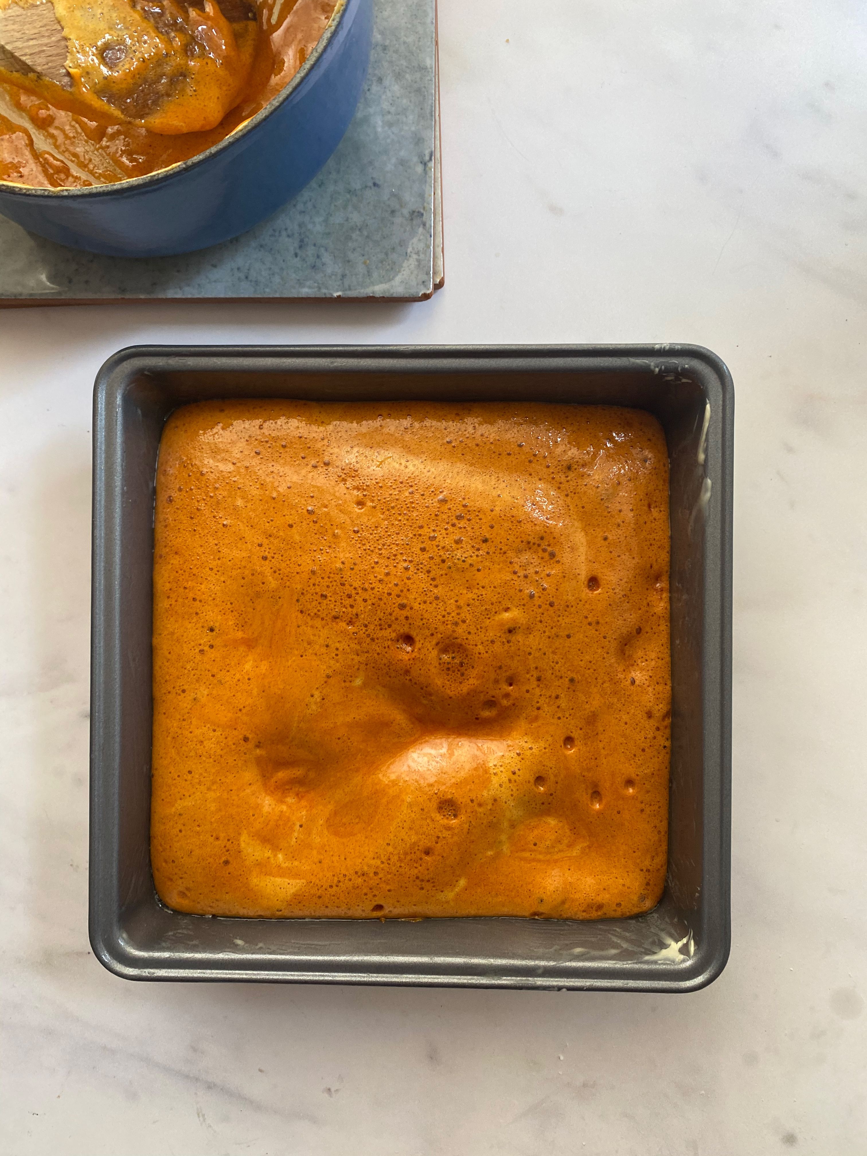 Step 3Meanwhile, make the Rowse Runny Honey honeycomb, butter a 20cm square tin. To a large saucepan over a low heat stir together the sugar and honey until the sugar has dissolved. Turn up the heat and carefully simmer to a dark amber and the sugar is bubbling or a sugar thermometer reaches 149C. Once bubbling, add bicarbonate of soda and mix thoroughly with a wooden spoon. Be careful as the mixture will start to quickly rise and become very foamy. Transfer immediately to the prepared tin and leave to cool completely for at least 30 mins to harden. To make the frosting, beat the butter in a table top mixer or a large mixing bowl with electric whisks for 2-3 mins until creamy and pale. Gradually add the icing sugar ⅓ at a time until fully combined, adding 2-3 tbsp milk to loosen. Add the Rowse Runny Honey and soft cream cheese and whip again for 30 seconds until creamy and thick. To assemble the cake, trim the tops to level them out. Pop one of the cakes onto a cake board or cake stand and layer with ½ of the frosting, continue with another cake and layer of frosting and finish with the final cake on top. With a thin layer of frosting cover the whole cake in a crumb coat and leave to chill for 30 mins.
